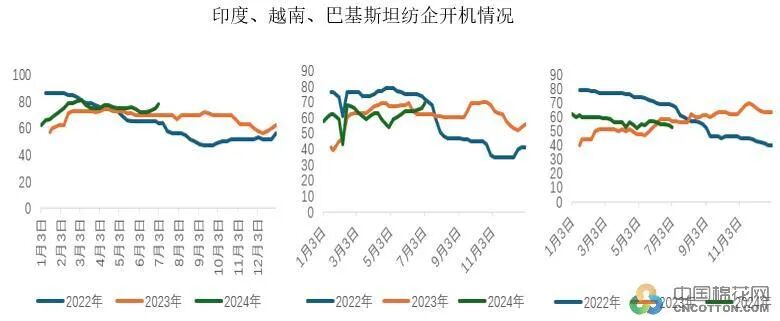 6月中下旬以来,印度和越南纺企开机率开始回升。上周末,印度纺企开机率为78%,周环比上升3个百分点,较6月初上升6个百分点;越南纺企开机率为69%,周环比上升3个百分点,较6月初回升5个百分点。巴基斯坦开机率仍然处于稳中有降的状态。上周末,巴基斯坦纺企开机率为53%,周环比下降1个百分点,较6月初下降3个百分点。