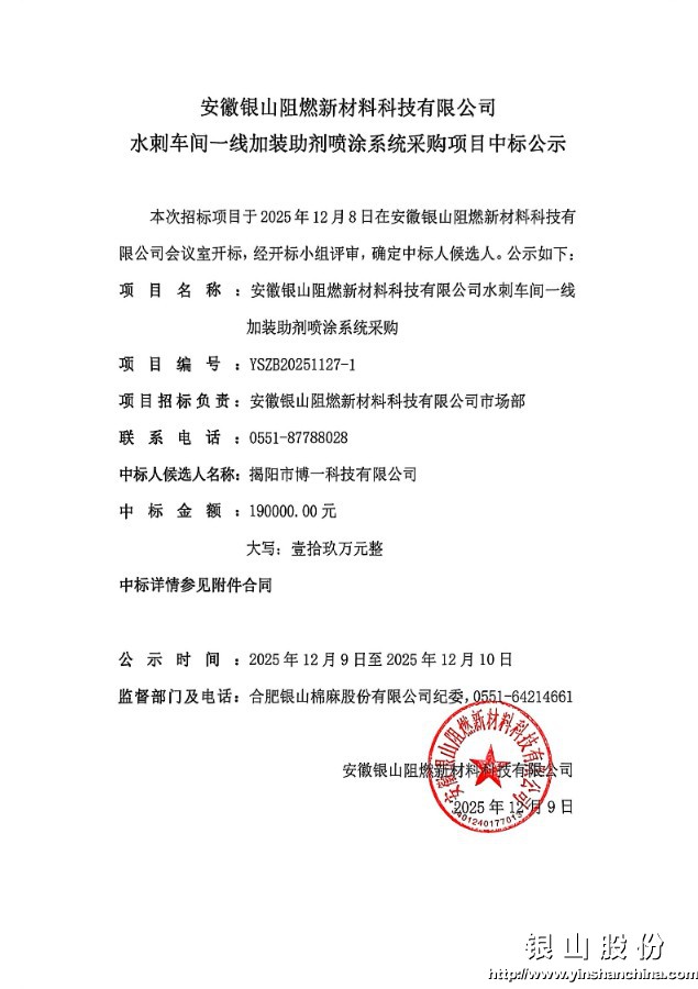 安徽银山阻燃新材料科技有限公司水刺车间一线加装助剂喷涂系统采购项目中标公示