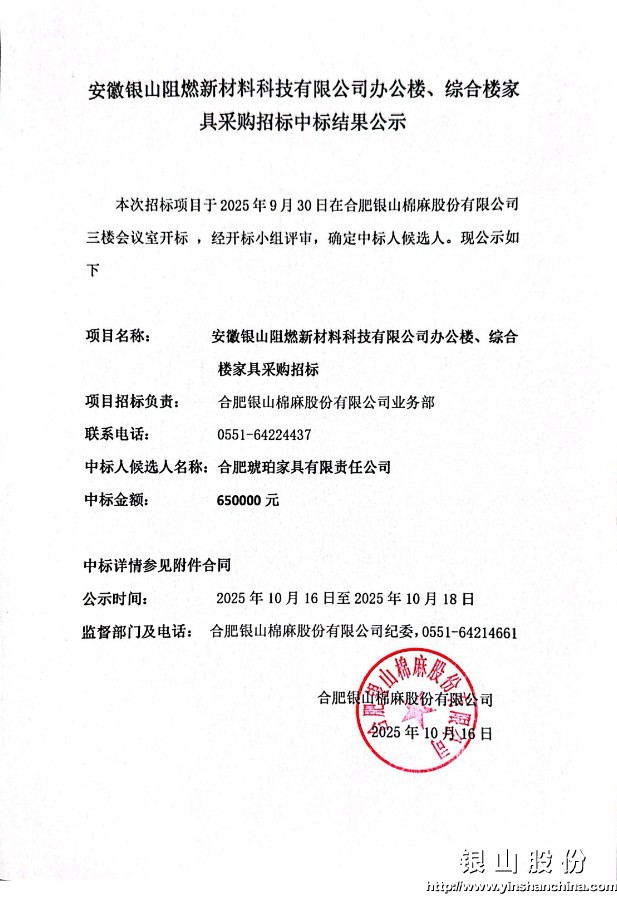 安徽银山阻燃新材料科技有限公司办公楼、综合楼家具采购招标中标结果公示