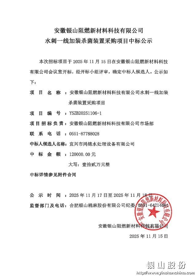 安徽银山阻燃新材料科技有限公司水刺一线加装杀菌装置采购项目中标公示