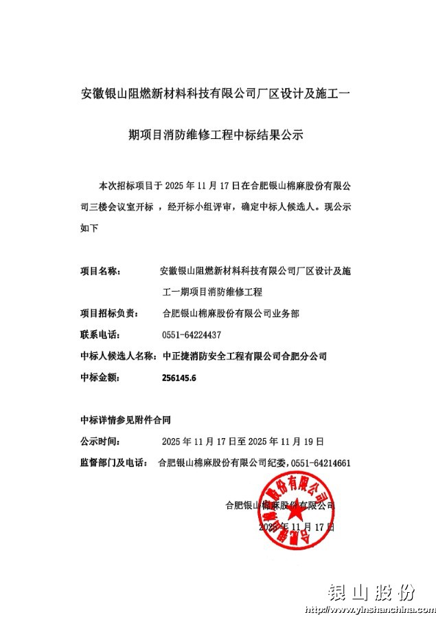 安徽银山阻燃新材料科技有限公司厂区设计及施工一期项目消防维修工程中标结果公示