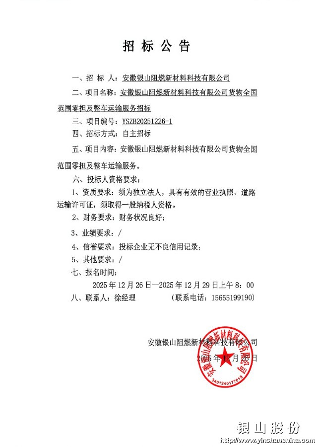 安徽银山阻燃新材料科技有限公司货物全国范围零担及整车运输服务招标