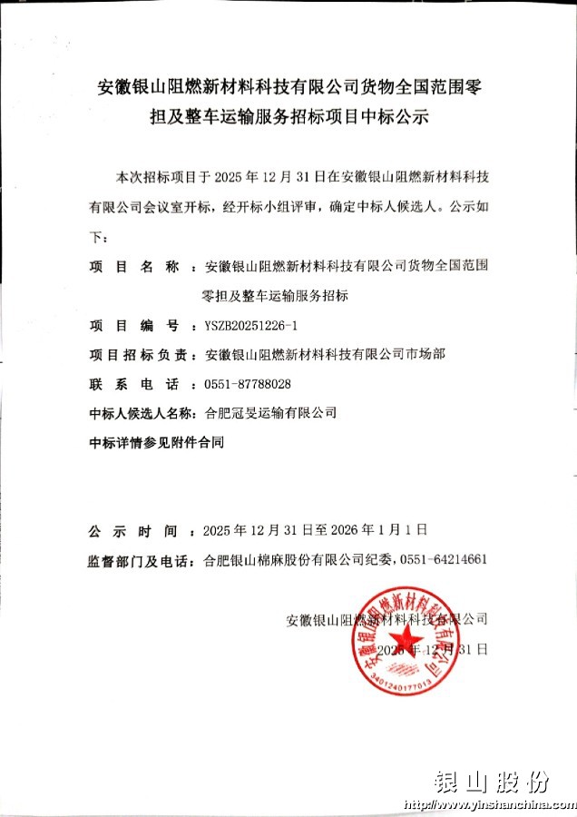 安徽银山阻燃新材料科技有限公司货物全国范围零担及整车运输服务招标项目中标公示