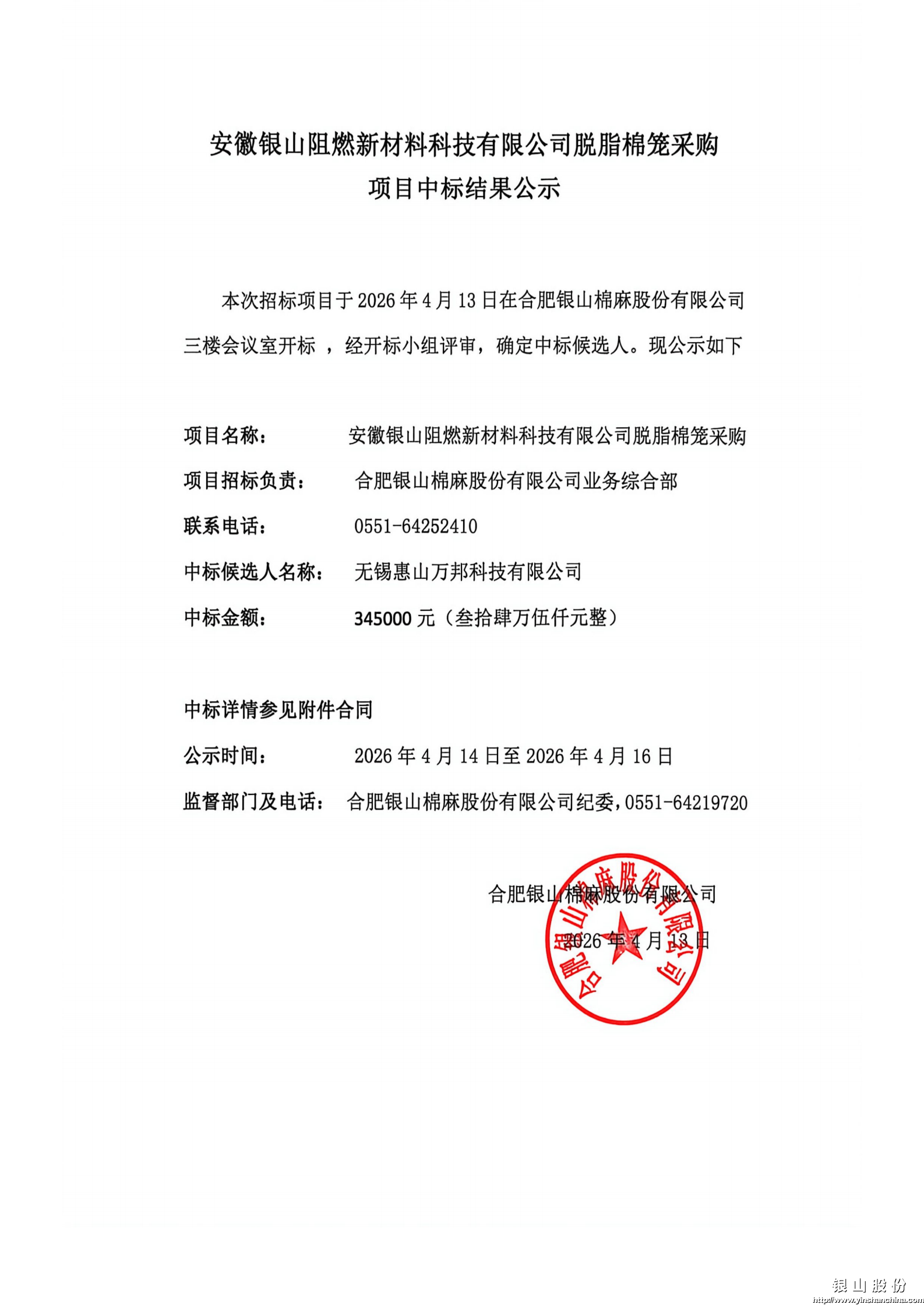 安徽银山阻燃新材料科技有限公司脱脂棉笼采购项目中标结果公示