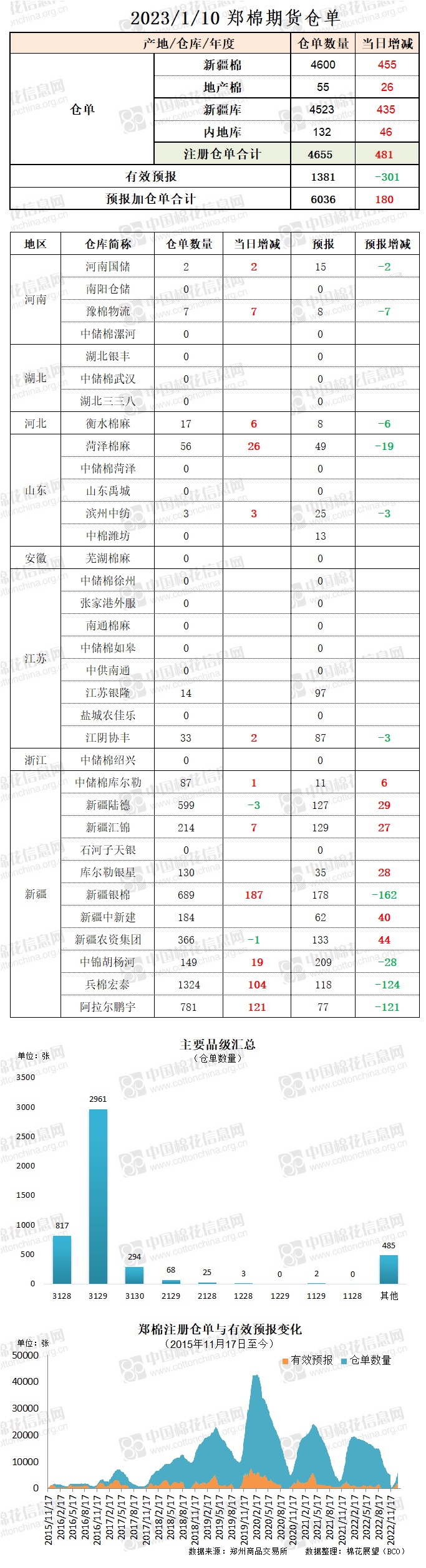 【郑棉期货仓单】注册仓单加有效预报增至6036张(1.10)
